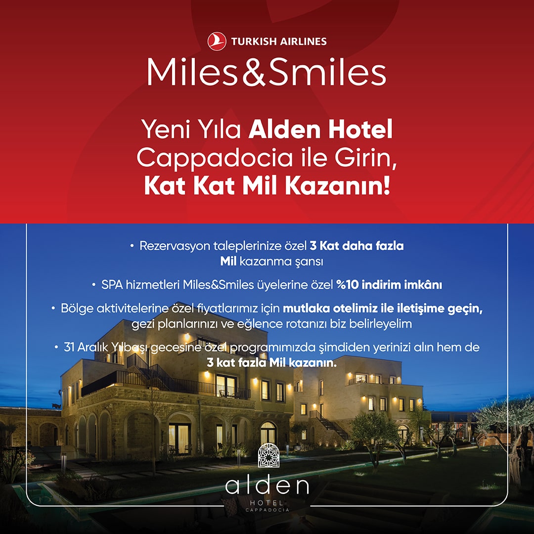 30 Aralık 2025 -01 Ocak 2026 tarihleri arasında 2 gece yılbaşı özel konaklamalarınızda, alden.com.tr üzerinden veya direkt otelden yapacağınız rezervasyonlarla, tatilinizi toplam 10.000 Mil kazancı ile taçlandırın.